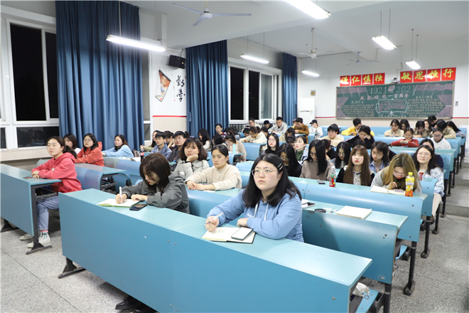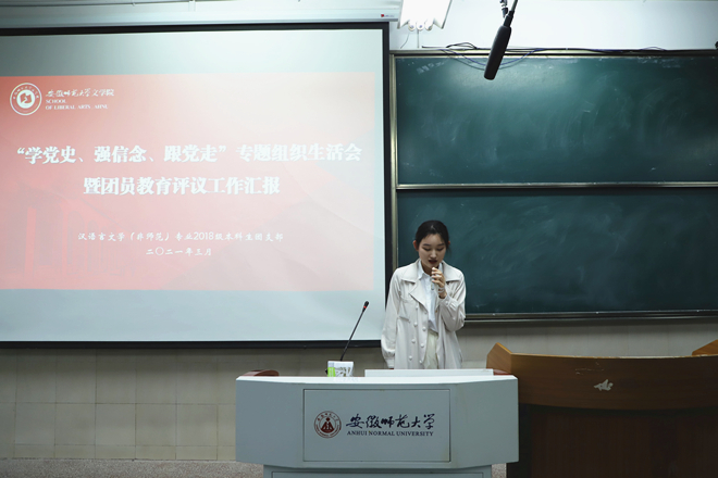 2021年是中国共产党建党一百周年,为了重温党的光辉历程,学习党的指导思想,同时对团员工作进行总结评议,3月25日晚7点,2018级汉语言文学(非师范)全体团员在行知楼2050204教室召开团支部组织生活会暨团员教育评议汇报。会议由团支书朱倩雯主持,校团委王悦老师参会。