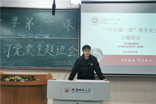为庆祝中国共产党成立100周年,加强对党的理论学习,了解新学期学生思想动态,3月16日至3月19日, 2018级汉语言文学(非师范)专业和2018级汉语言文学(卓越语文)专业结合党史教育共同开展了新学期“开学第一课”系列活动,辅导员凌德喜主持并参加了活动。