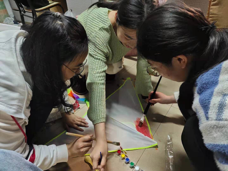 在活动正式开始之前,万振锐首先向大家介绍了此次活动的目的及开展方式,本次活动融入班级特色,旨在颂扬中国共产党带领中国人民历经百年奋斗终于走上中华民族伟大复兴征途的丰功伟绩。随后,由寝室长作为代表领取了风筝、画笔和颜料,同学们都迫不及待、跃跃欲试。会议结束后,同学们便以寝室为单位,在各自的“温馨小家”内一同围在风筝周围,用画笔沾上彩色颜料,为风筝增添色彩。大家放飞思维,大胆创作:有的混合黄色与橙色颜料,描绘出党徽的形状;有的写下“建党100周年”的大字;有的还画上大大的爱心寓意着“红心向党”。一笔一划,千皴万擦;一提一转,千点万染。远处是白鸽飞翔,党徽所向;近处是星星之火,红旗飘飘。一只只风筝是全体成员团结一致,怀着庄严肃穆的的心情,共同绘就的献党礼物。手绘风筝虽小,但它也可以展现出党的百年奋斗历程和辉煌成就,讴歌新时代新气象新作为。