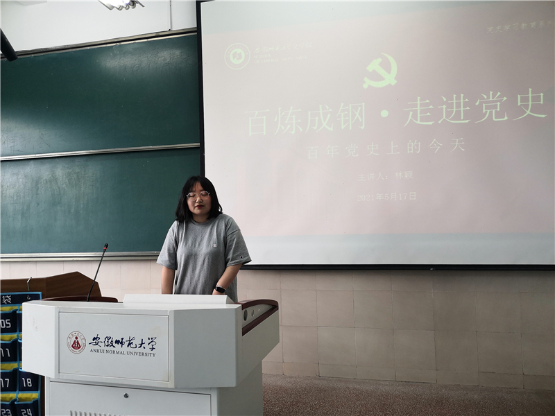 触碰党史今日,总结历史经验。2021年5月18日,2019级汉语言文学3班于2050301开展党史学习教育,林颖向全体同学展示了“百年党史的今天”,讲述了6件5月17日至5月21日的党史大事件,如1980年5月17日,刘少奇追悼大会在北京隆重举行;1936年5月18日,中央革命军事委员会发布西征战役行动命令。同学们坚持长期开展党史小故事分享活动,致知力行,踵事增华。