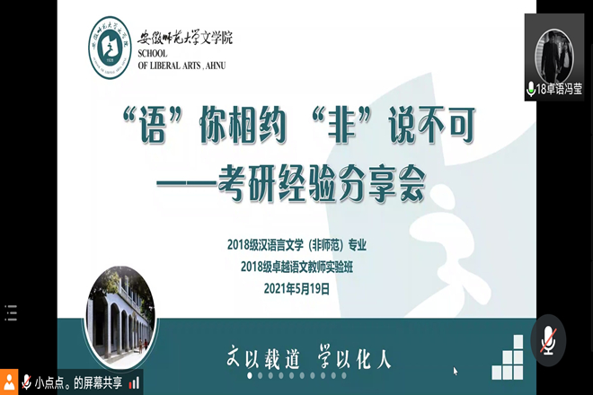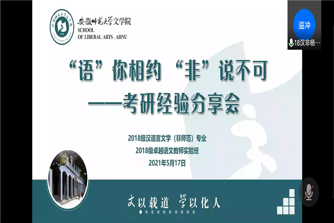 “语你相约”系列讲座第七、八期暨考研经验分享会(上)、(下)分别于2021年5月17日与5月19日晚7点在腾讯会议成功举办。2017级汉语言文学(师范)李娜、丁宁、祁爽与2017级汉语言文学(非师范)傅亚炜应邀主讲考研经验分享会(上);2017级汉语言文学(非师范)韩明兴、刘婷婷,2017级汉语言文学(师范)武娅娴、宋丽丽应邀主讲考研经验分享会(下)。2018级汉语言文学(非师范)专业和2018级卓越语文教师实验班入会聆听。讲座第七期由2018级汉语言文学(非师范)杨溢冲主持,第八期由2018级卓越语文教师实验班冯莹主持。