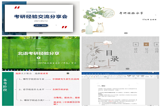 在两次考研经验分享会中,主讲人们分享了自己在考研择校、复习和备考等各方面的经验。李娜从学校排名、专业水平、报录比三个方面为同学们说明如何择校,认为正确的选择非常重要;傅亚炜重点介绍了自己的专业课复习经验,分享了他在复习中受益匪浅的语言学资料和书籍,强调大综合考研最重要的是列大纲、捋线索,记基本知识点;今年上岸北京语言大学的丁宁建议同学们向师长寻求择校的建议和帮助,并将自己复习的时间节点提供给大家参考,鼓励大家在复习过程中保持良好心态;祁爽对英语复习有自己的一套经验,他将自己的时间规划以文本的形式呈现出来,详细解答大家的疑惑。