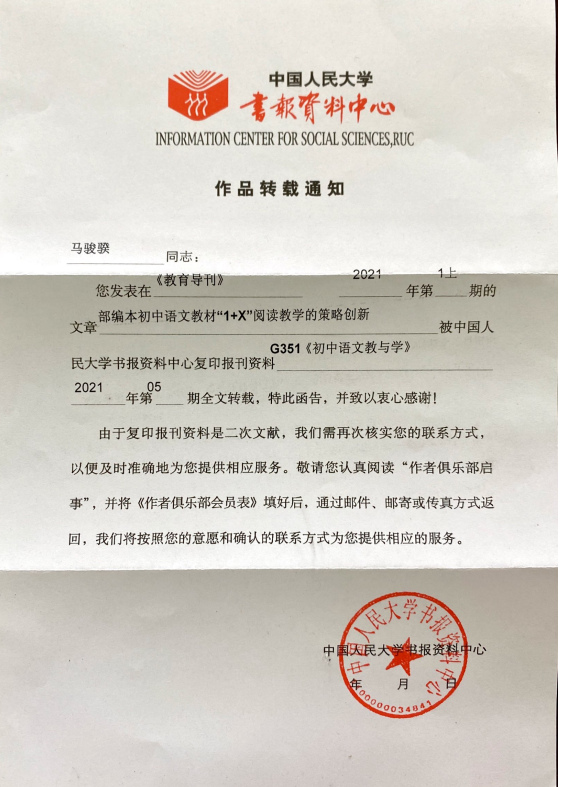 近日,我2019级课程与教学论(语文)专业硕士研究生马骏骙同学在《教育导刊》2021年第1期发表的部编本初中语文教材“1+X”阅读教学的策略创新》一文被中国人民大学书报资料中心复印报刊资料(人大复印资料)初中语文教与学全文转载。
