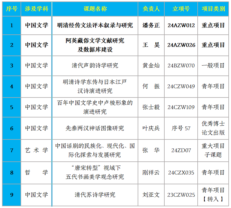 近期,全国哲学社会科学工作办公室公布了2024年国家社会科学基金各类项目立项结果。本年度,我院共新增9项,其中重点2项,青年4项,一般1项,重大项目子课题1项,后期优秀博士学位论文出版1项(为我校首次获批)。中国文学学科立项总数居全国前列(并列第二)。