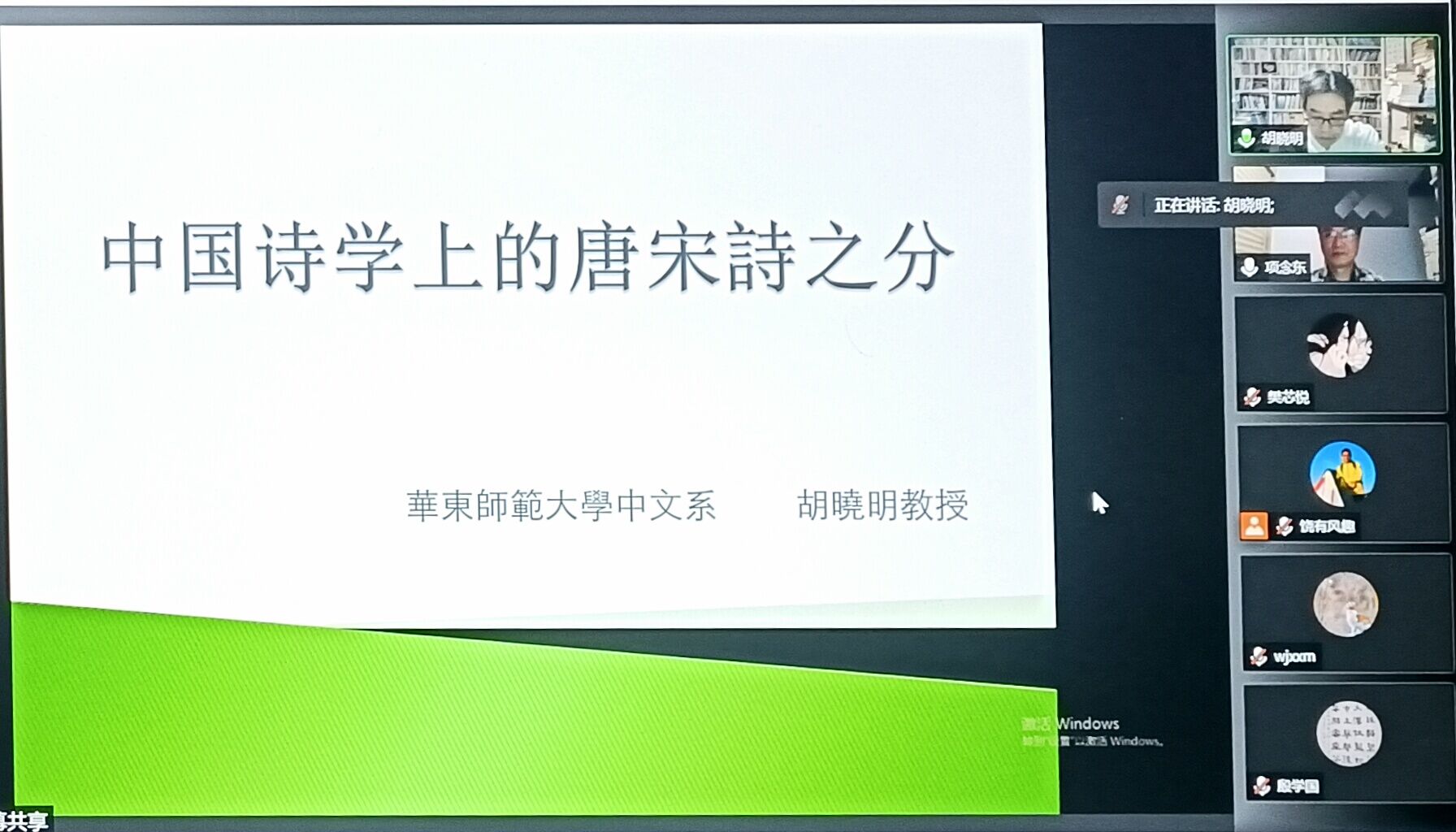本次讲座的主题是“中国诗学中的唐宋诗之分”。讲座伊始,胡晓明教授即指出,“唐宋诗之分”是中国诗学的一个“老”话题,自宋代以来类似“情-理”“才情-学问”“自然-人文”“兴象风神-筋骨思理”二分的评论不绝于耳。必须警惕“一代有一代之文学”观念的误导,“唐宋诗之别”非时代先后之分,而更是一种深受唐宋文化影响的诗美学之分、诗的精神意态之分。实际而言,唐诗中有宋调,宋调中亦可见唐音,唐宋诗之分实为唐型诗歌与宋型诗歌之别。