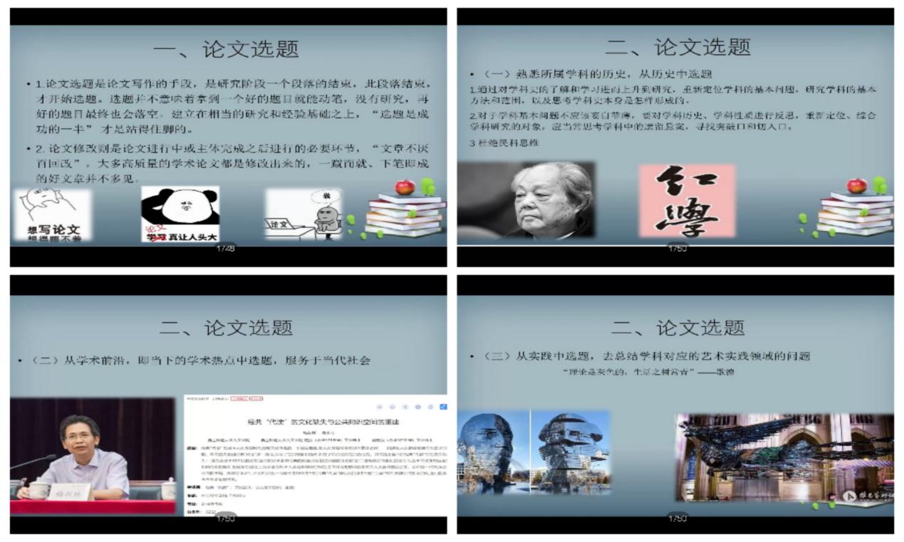 合抱之木,生于毫末。孙伟科教授从“论文选题”讲起,结合自身几十年的经验总结了以下三个角度:一是“熟悉所属学科的历史,从历史中选题”,要求研究学科的基本方法和范围,对学科历史、学科性质和学科遗留悬案进行思考,杜绝民科思维;二是“从当下的学术热点中选题,服务于当代社会”,特别分析了梅新林教授的论文,指出选题可以对当前文化和学术热点进行分析,探寻其背后的问题;三是“从实践中选题,总结学科对应的艺术实践领域问题”,孙教授列举了《红楼梦》被多种艺术种类改编的事例,指出选题应联系实践领域和文学前沿。