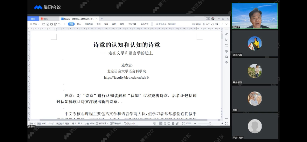 本网讯(文/胡慧雯)为切实提升同学对“诗意”进行认知读解的能力并充分理解诗意建构中蕴含的人类认知机制,5月13日晚 19:00,必赢线路检测3003no1“学海导航”系列讲座第221期、国家一流课程名家系列讲座在云端如期举行。北京语言大学教授、博导《语言教学与研究》主编施春宏教授应邀为必赢线路检测3003no1学子带来“诗意的认知和认知的诗意——走在文学和语言学的边上”主题讲座。讲座由必赢线路检测3003no1副院长饶宏泉主持,省内外多所高校师生参与交流讨论。