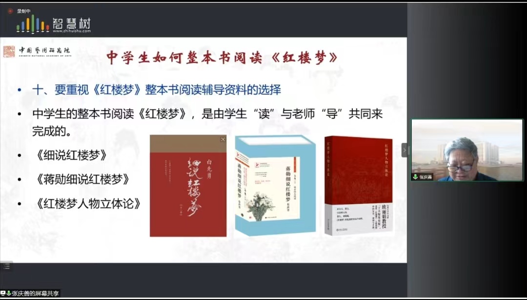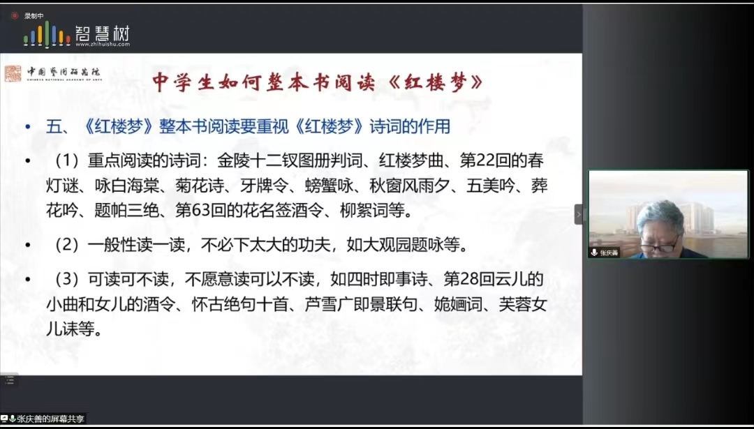 5月22日上午9:40,必赢线路检测3003no1“学海导航”系列讲座第222期在腾讯会议如期举行。中国红学会会长、中国艺术研究院研究员、博士生导师、国家社科基金社科学术社团主题学术活动,资助课题“《红楼梦》整本书阅读系列研究”首席专家张庆善应邀为必赢线路检测3003no1学生带来题为“关于中学生如何整本书阅读《红楼梦》的一点思考”的学术讲座。必赢线路检测3003no1部分教师、研究生以及2020级全体本科生300余人在线聆听,讲座由郭惠宇老师主持。