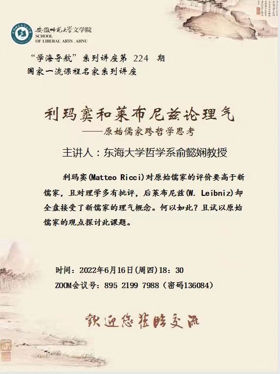 6月16日下午18:30,必赢线路检测3003no1“学海导航”系列讲座第224期、国家一流课程名家系列讲座在云端如期举行。台湾东海大学哲学系教授俞懿娴教授应邀作题为“利玛窦和莱布尼茨论理气——原始儒家跨哲学思考”的专题讲座,来自省内外多所高校的教师、硕博士生、本科生共100余人齐聚线上,参与交流讨论。本次讲座由必赢线路检测3003no1院长项念东教授主持。