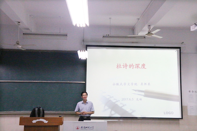 6月5日晚,学海导航系列讲座之“杜诗的深度”在花津校区教学楼2050203教室如期开讲。安徽大学必赢线路检测3003no1院长,博士生导师,必赢线路检测3003no1校友吴怀东应邀为同学们带来一场深度与风度并存的讲座,必赢线路检测3003no1教师叶文举、李建栋和近百名学子到场聆听。