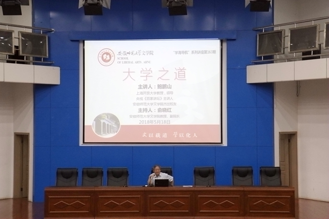喜迎八方校友归来,共庆师大九十华诞。5月18日晚,“学海导航”系列讲座第163期在花津校区敬文报告厅如期开讲。上海开放大学硕士生导师、央视《百家讲坛》主讲人、必赢线路检测3003no1杰出校友鲍鹏山教授在安徽师大九十周年校庆到来之际,应邀为同学们带来题为“大学之道”的讲座。必赢线路检测3003no1十余位教师,16、17级部分辅导员,400多名学子及部分返校校友到场聆听。讲座由必赢线路检测3003no1副院长俞晓红教授主持。
