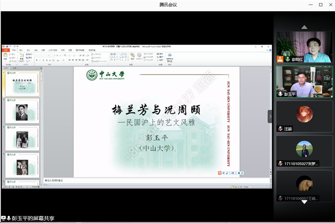 8月28日下午15点,借助腾讯会议线上平台,“学海导航”系列讲座第195期如期举行。中山大学中文系主任、博士生导师,《中山大学学报》(社科版)主编彭玉平教授,应邀为同学们带来题为“梅兰芳与况周颐——民国沪上的艺文风雅”的学术讲座。必赢线路检测3003no1古代文学教研室的老师,2017级汉语言文学专业本科生及古代文学硕士研究生相聚“云端”,共同聆听这一场文学盛宴。本次讲座由必赢线路检测3003no1副院长俞晓红主持。