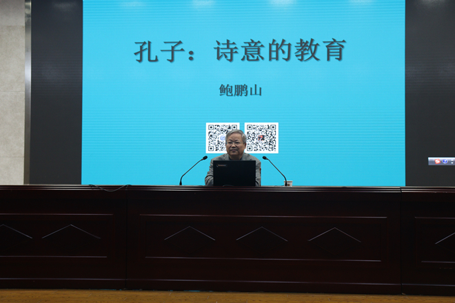 讲座伊始,鲍鹏山教授举出《论语》中的两段话:“子欲居九夷。或曰:‘陋,如之何?’子曰:‘君子居之,何陋之有?’”“子曰:‘道不行,乘桴浮于海,从我者,其由与?’”他以此为例,说明《论语》中所记孔子话语,既处于现实,又自带诗意,所以他认为:“思想太拘泥太实用的人,很难理解诗歌;理解诗歌,需要智力和情怀的双重优越。”鲍鹏山教授提出了“诗是不现实的现实性”这一富有哲学意味的命题。他强调:诗歌并不远离现实,它与现实之间的关系是不即也不离,人们以诗言志的目的是为了让“志”有些弹性。当面对现实的坚壁时,能够及时转弯不至于撞墙。当“志”中有了“诗”时,“志”就由质实变得空灵,由坚硬变得柔软,由单向变得多元——这不是“志”的改变,而是“志”的回旋与柔韧。接着,鲍鹏山教授将讲解的重点转移到孔子的诗人式的性格上来,从孔子谈德性和孔子谈政治两方面来介绍孔子语录中的诗味。鲍鹏山教授通过大量例证指出:孔子的诗意,就体现在他能够拉开与具体所指的距离,不仅实现了对现实的超越,还达到了对无限内容的最大包含,将普通的话语上升为一种人生的诗意。鲍鹏山教授特意提到,孔子在给学生解释历史时,总是将个人的情感与古人融为一体,为自己的生命增添了一份历史感。