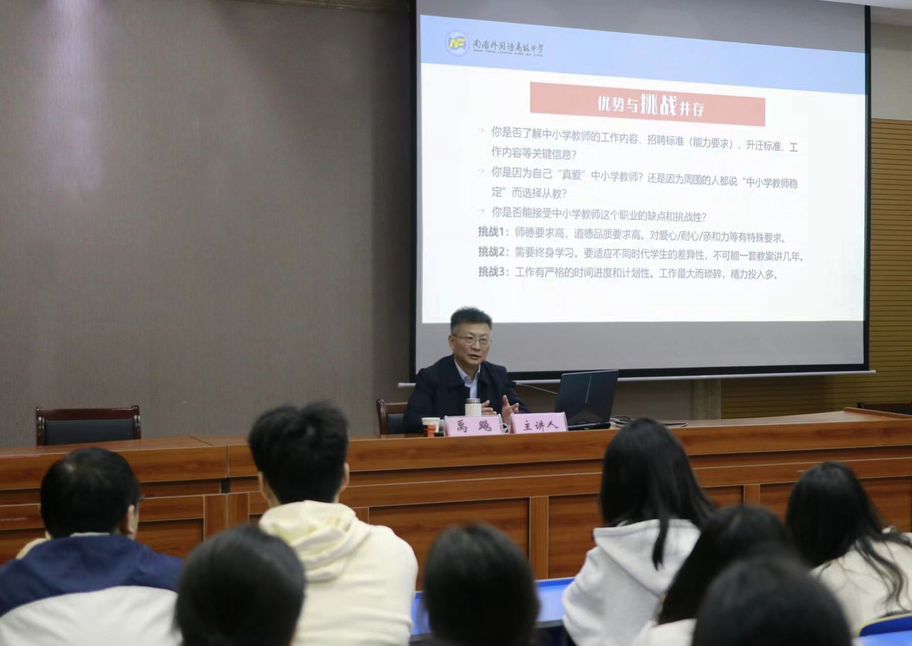 禹飚校长由几个学生的故事引入,探寻做老师的动机与初心,讲述了不同专业背景的学生最终走向教师的道路,并取得了一系列成就的故事,令人深受鼓舞。在对老师这一职业的理解方面,禹校长深入剖析,提出“挑战与优势并存”,分析利弊。同时,以“霍兰德理论”和“生涯决策平衡单”促进学生思考,结合自身实际,得出教师职业与个体的适配度,帮助促成个性化职业规划。