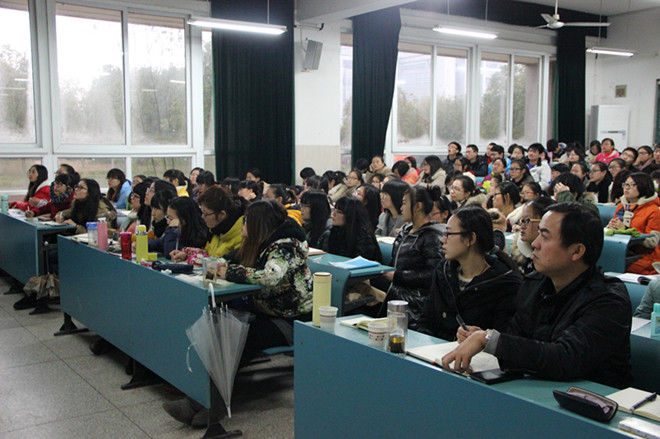 盛庆丰老师围绕“语文教学内容何以要确定”“哪些作品的教学内容难以确定”和“教师如何做好对教学内容的确定”三个问题展开,条分缕析,见解独到,在听众中引起强烈共鸣。盛老师认为教育的本质就是:“一棵树摇动一棵树,一朵云推动一朵云,一个灵魂呼唤另一个灵魂”。从中学语文课文《祝福》切入主题,他积极与学生互动,指出 “文学是人生”,“语文反映的是一种生命的状态”, 语文教学内容的确定是为了满足学生的需要。通过对《祝福》中祥林嫂形象别出心裁的解读,盛老师揭示了“文学作品观照人生、展示永恒人性”的本质,强调语文教师应该独立解读文本,摆脱教参的束缚,反思“教学三维目标”存在的问题。盛老师分别以《望江楼》《荷塘月色》《红楼梦》教学内容为例,生动传神地展现其独特的教学处理,让在座的同学领略了语文课堂的迷人魅力、教学内容确定的新颖角度。盛老师以对《越中览古》简短、凝练的解读结束讲座。整场讲座设置多个典型问题,与学生深入互动,现场气氛热烈,不时爆发阵阵掌声。盛老师幽默风趣的语言、独树一帜的见解、洒脱轻松的教态折服了现场听众。王昊老师最后简要总结了讲座内容,希望同学们领会教学内容确定的方法,在以后见习、实习的过程中不断提高教师教育能力,早日成长为优秀的语文教师。