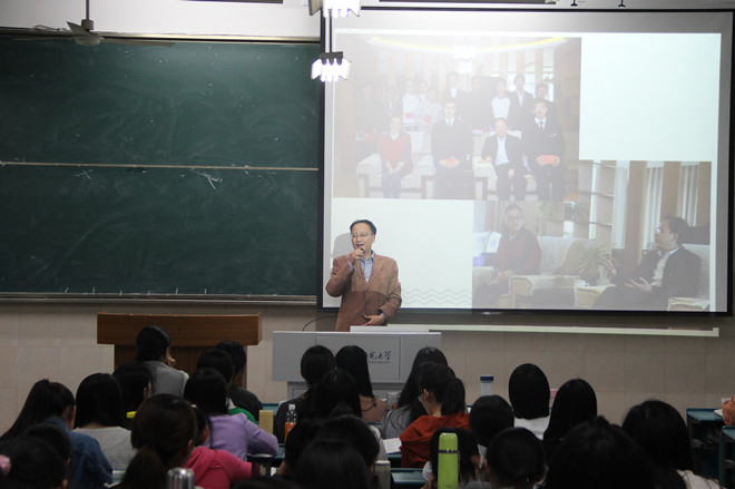 俞晓红作简要点评。她用“感谢、感动、感慨”三个关键词来表达对讲座的感受,希望在座的同学能够领略、学习名师精神,并从现在做起。 (新苑通讯社:文/高晓宇 图/张丁)