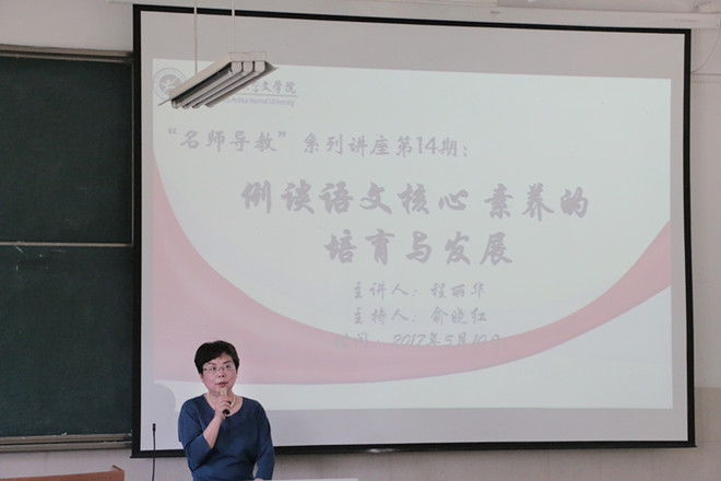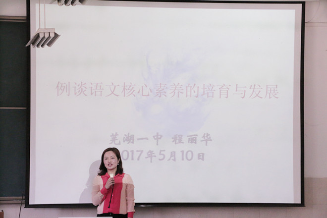 5月10日下午,“名师导教”系列讲座第十四期在行知楼2050103教室如期开讲。中学高级教师、芜湖一中语文教研组长、芜湖市语文教研大组组长、安徽省教育学会中学语文教学法专业委员会常务理事程丽华老师,应邀为必赢线路检测3003no1学子带来题为“例谈语文核心素养的培育与发展”的专题讲座。讲座由必赢线路检测3003no1副院长俞晓红教授主持,必赢线路检测3003no1夏家顺副教授和百余名学生到场聆听。