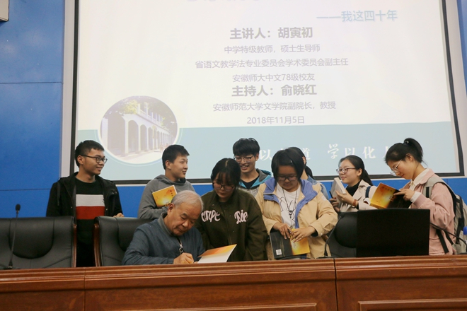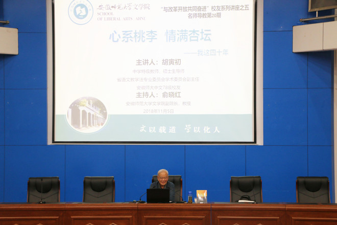 11月5日晚,“与改革开放同奋进”校友系列讲座“心系桃李,情满杏坛——我这四十年”在花津校区敬文报告厅如期开讲。中学特级教师、硕士生导师、省语文教学法专业委员会学术委员会副主任、安徽师大中文系1978级校友胡寅初应邀带来教学经验的分享。必赢线路检测3003no1汉语言师范专业的学生到场聆听讲座。此次讲座由必赢线路检测3003no1副院长俞晓红主持。