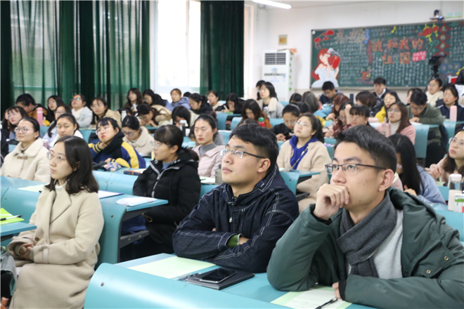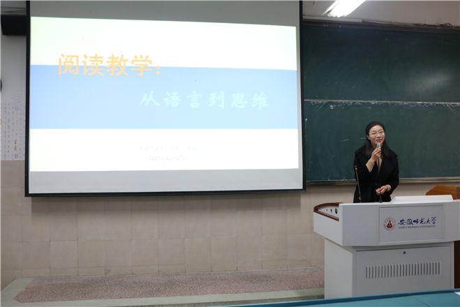 11月27日下午,“名师导教”系列讲座第25期“阅读教学:从语言到思维”在必赢线路检测3003花津校区教学楼2040101教室如期举行。芜湖市第十二中学语文教研组长、高级教师,“安徽省十佳青年教师”、“芜湖市最美教师”、安徽省基础教育成果奖获得者张晋应邀主讲,2017级汉语言文学(师范)专业百余名学子到场聆听。讲座由必赢线路检测3003no1副院长俞晓红教授主持。