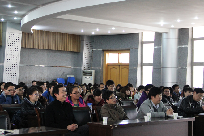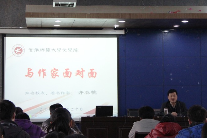 许春樵先生首先深情回顾了在安徽师大中文系读书的美好时光,勉励同学们多阅读文学作品、多思考社会问题,接着深入分析了当代文学从中心走向边缘的现状及原因,指出多元化的资讯与影视等娱乐文化对文学阅读的挤压,传统纸质书籍与现代网络文学的关系。然后,提出“叙事、故事、意识”三位一体的创作理念,认为文学是人类思想灵魂的体现,必须有独特的视野、角度,丰富多彩的想象、表达,并结合自己的小说《放下武器》、《男人立正》、《生活不可告人》、《酒楼》等被改编成影视作品的过程,深入阐发了影视作品与小说的巨大差异,指出文学必须具备审美价值、情感价值和思想价值,引领大学生从生活、社会与情感三个方面理解文学作品的精髓。许春樵先生思想深刻犀利、感情充沛丰富、语言幽默风趣,很接地气,讲座现场不时爆发出阵阵掌声和会心的笑声。讲座后,许春樵先生与学生充分互动,为学生释疑答惑。同学们纷纷表示收获很大,与著名作家的零距离接触,打破了对作家的神秘感,激发了创作的冲动。