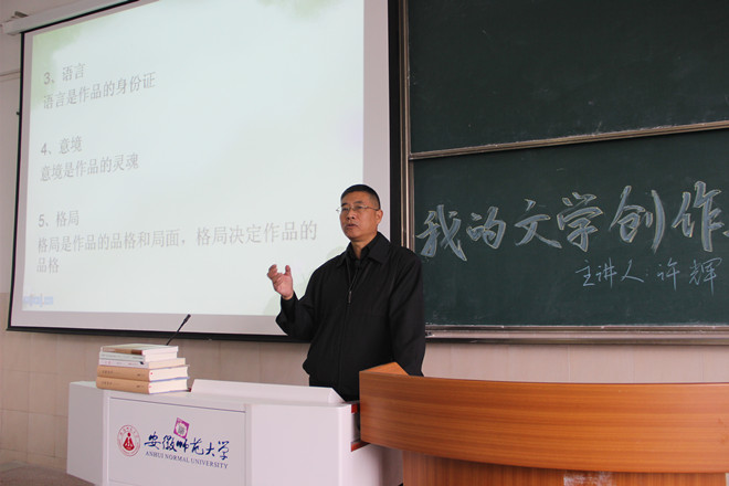 许辉老师的讲座主要有两大部分:第一部分以曾列为2010年安徽省高考语文阅读试题的小说作品《碑》为例,介绍其主要内容与艺术虚构,解析他寄予作品的思想意蕴和艺术技巧,并阐述创作《碑》的文学准备;第二部分畅谈自己对文学创作显性条件和隐性条件的诸般思考。许辉指出,文学创作既要有单一性,又要有丰富性。单一性指作家要拥有个人对文学作品的独到见解,丰富性则要求作家具有良好的写作能力,丰厚的生活阅历和独特的发散思维。他认为,上述都是一个优秀的文艺创作者所必备的显性条件。“但是,是否只要具备了这些,就能创作出好的文学作品呢?”许辉接着说明,创作的成功还必备诸多隐性的因素。他将地理、文化、语言、意境、格局、生活、学养、气质、运气和缄默知识这十个方面归为文学创作的隐性条件。许辉老师强调,“缄默知识是文学创作的真谛和必由之路。但具备了缄默知识,不一定写出好的作品;不太具备缄默知识,也可能写出好的作品。正因为文学创作前景难卜,才更能激发我们的创作欲望,进行纯粹、真我的文艺工作”。讲座后,许老师和同学们展开精彩互动,悉心为大家答疑解惑,并将相关书籍作为礼品赠送前五位提问的同学。