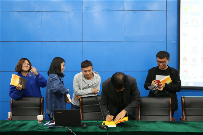 沈老师的讲座思路流畅而又严谨,内容丰富多彩,语言风趣幽默,既有文学创作的感性,又有理论阐释的深度,体现了他丰富的生活阅历、深厚的文学功底和不凡的诗家才华。说到兴高采烈处,他常常发出开朗的笑声,神情可爱,精神酣然。讲座结束后,方维保、杨四平、张应中三位老师与沈天鸿老师就文坛热议的鲁迅文学奖、文学创造和中医及哲学的关系,怎样将感性与理性、抽象与具体相结合等问题,进行了富有深度的探讨。多位学子也提出文学写作的见解和疑虑,沈天鸿老师悉心为同学们指点迷津、答疑解惑。最后,沈天鸿为积极提问的同学赠送了收有他自己作品的《峰回路转——我们的1978》一书并签名。现场气氛十分热烈。