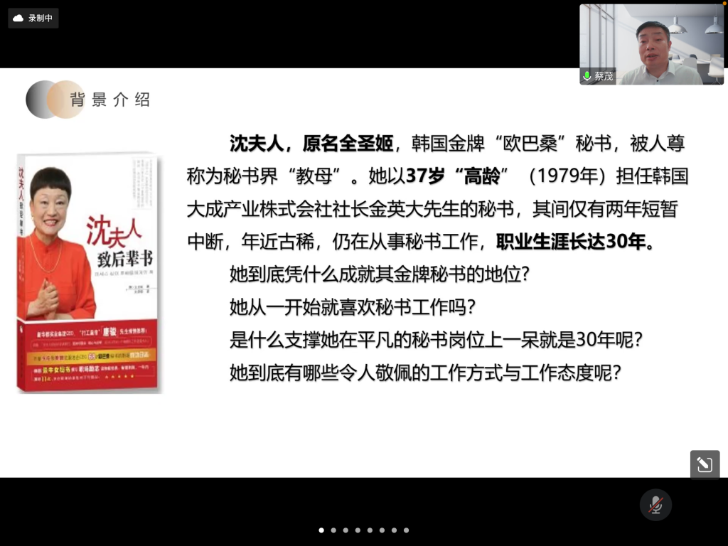 蔡老师主要从五个方面解读了沈夫人如何成为“金牌秘书”的关键要素。首先,要具备成熟稳定的个性,这是由秘书工作内容与工作性质决定的,拥有成熟的个性往往比高学历更加重要。其次,要终身学习,追求卓越。在高速发展的时代,秘书工作的内容与形式都在发生着变化,秘书唯有始终保持学习的状态才能适应社会发展,不被时代抛弃。再次,秘书要做到不在背后议论上司、成为领导的“左膀右臂”,与上司建立起亲密无间的合作伙伴关系。
