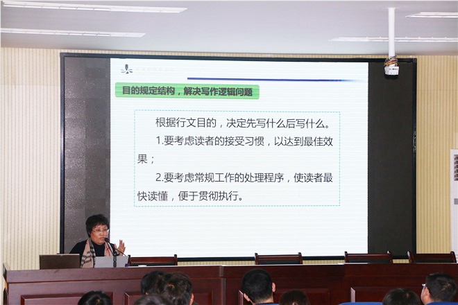 讲座伊始,董宇教授就“如何写好公文”这一主题展开论述,开门见山地指出公文最重要的是其“目的”,公文写作的本质就是目的导向。接着她从目的决定内容、目的规定结构、目的限定情绪等方面详细解答了公文写作中写什么、如何解决写作逻辑、怎么写等问题。在内容上,董宇教授列举出公文写作的反面实例,严谨地将这一方面的写作模式归纳为两类,强调结合自身的经验、体会、教训使公文更加丰满,带给读者启发,做到言之有物。在结构上,董宇教授要求写作者要根据写作目的,加以独立的写作逻辑,同时充分考虑读者的阅读习惯与常规工作的安排顺序,从而决定内容的前后,以达到最佳的阅读效果和执行效率的最大化。在情绪方面,董宇教授则鼓励尝试写作公文的同学适当运用语言技巧,在不同的语境下使用不同的情绪和语气进行写作,使公文交流更加流畅自如。介绍技巧之余,董宇教授也提醒同学们,在写作公文之前一定要了解国家的法律法令、单位的基本情况、熟悉常见工作的基本情况,明确工作中常用的相关概念,避开公文写作误区。