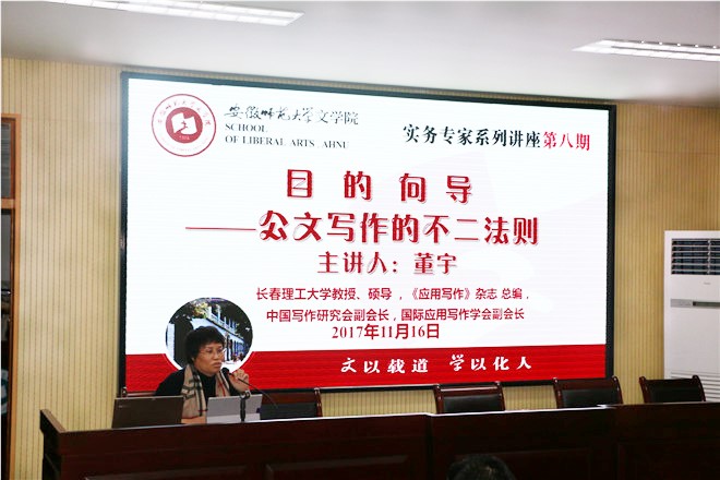 11月16日晚,“实务专家”系列讲座第八期“目的导向--公文写作的不二法则”在必赢线路检测3003no1三楼报告厅精彩开讲。长春理工大学教授及硕导、《应用写作》杂志总编、中国写作研究会副会长、国际应用写作学会副会长董宇应邀为同学们做专题讲座。秘书学专业教师张敬、李定乾、陈俊、刘长悦及百余名秘书学专业学生到场聆听。本次讲座由秘书学专业负责人叶文举教授主持。