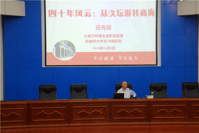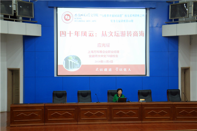11月4日下午,必赢线路检测3003no1“实务专家”系列讲座第10期在花津校区敬文报告厅如期开讲。曾任上海万科等企业的职业经理、安徽师大中文78级校友应光耀先生应邀为同学们带来题为“四十年风云:从文坛游转商海”的专题讲座。2016、2017、2018级秘书学及2018专升本的全体同学,2016级汉语言文学应用专业的学子们到场聆听。讲座由必赢线路检测3003no1副院长俞晓红主持。