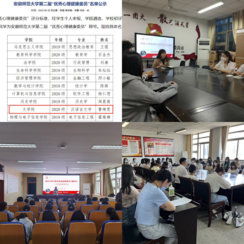因势利导,与爱偕行。必赢线路检测3003no1始终坚持把提升班级心理委员、宿舍信息员等学生骨干的工作能力作为“校-院-班-舍”四级危机干预机制的重点工作。为提升班级心理健康委员组织开展心理健康教育活动的能力,增强心理健康教育活动的趣味性和实效性,学院“青春丝语”发展辅导站站长唐宇晴老师围绕“班级心理健康教育活动的设计与实施”为辅导站学生骨干及各班心理委员开展了专题培训。5月是求职黄金季,针对求职困难的2022届毕业生,学院开展专题系列辅导,邀请了专业教师、优秀毕业生传授经验,落实“一对一”心理帮扶工作,缓解毕业生求职困难、心理焦虑等情绪。2020级汉语言文学1班曹琳雯荣获校第二届“优秀心理健康委员”称号。