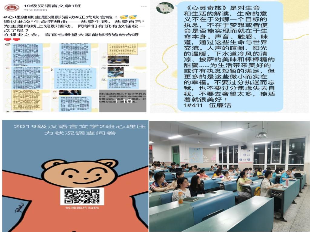探索打造院班两级工作机制,开展专业特色活动。各班级积极响应号召,开展多彩纷呈的特色活动。2019级汉语国际教育专业开展以“温暖阳光,你我共享,心心相惜,健康同行”为主题的心理健康主题班会,组织进行“你画我猜”“二人手”等趣味活动,通过游戏的方式营造轻松愉悦的氛围,帮助同学缓解心理压力,增强班级凝聚力;2020级中国语言文学类三班以母亲节为契机,结合心理健康教育活动开展心理健康主题班会,通过感恩母爱进而体悟到美好生活来之不易,应当感恩身边人、身边事,感恩自己;2019级汉语言文学一班组织开展心理健康观影活动,通过观看经典电影《心灵奇旅》,引导同学们敬畏珍惜生命的宝贵、感知发现日常生活的美好;2019级汉语言文学二班创新形式,采取线上线下结合方法同时开展心理健康知识竞赛,并发放心理调查问卷,全面了解班级同学心理健康状况,分析心理压力构成因素,针对存在的问题向同学们积极宣传普及有关心理健康方面的知识。