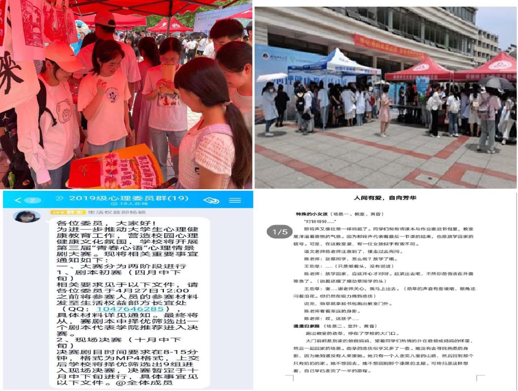 学院积极响应并配合学校开展以“危机 理性成长”为主题的“5.25”心理健康宣传教育活动,结合学院和社团特色,探索发现特色创新、多样育人的途径,为广大师生们带来亲手制作的精美书签和创意剪纸,并有专业学员指导师生动手创作,广受来往师生欢迎,现场气氛热烈。同时积极开展院级第三届“青春心语”心理情景剧比赛,通过动员参加、遴选推荐、专业指导等方式在众多优秀作品中评选出主题鲜明、剧情丰富、效果突出,有较高心理健康教育意义的作品上报至学校参与校级决赛。