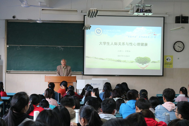 许智权老师从大学生人际关系谈起,并重点讲解了大学生人际交往的基本内容,提出了人际交往应追求心灵的融和相互的理解,分享了控制情绪的十种常见方法。随后,许老师又围绕性心理与同学们进行了详细讨论。许老师从自然界的动植物入手,介绍了性的含义和作用,又分别从友情与爱情、性活动、性意识等方面耐心细致地讲授。最后,许老师就大家关心的大学生是否应该有婚前性行为、是否应该在大学期间谈恋爱等问题一一作了解答。