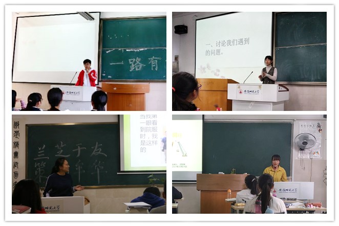 各班级通过召开主题班会普及心理健康知识同时辅以影片赏、案例剖析等形式多方面度展现心理健康在学习和生活中的隐形力量。16级卓越语文实验班开展以“兰芝于友,策马年华”为主题班会,举行“一颗糖的甜蜜”“卓语,we are family!”等活动,敞开心扉话友谊,拉近彼此之间的距离。17级汉语言文学非师范专业通过“我”“我的大学”“致室友”“我的生活”四个板块,多角度总结自己的心理历程,并集体观看《中国女排》《致室友》视频,增自我认知和集体荣誉感。