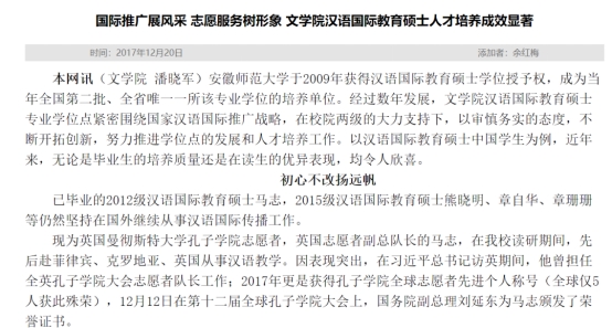 必赢线路检测3003no1办学历史悠久,积淀深厚,具有中国语言文学一级学科博士和硕士学位授权点,还具有和汉教专业最为密切的汉语国际教育硕士专业学位点,该学位点于2009年获批,设置时间为安徽省第一批,而且是当年安徽省唯一一所汉硕培养单位。这为人才培养提供了持续发展的动力。