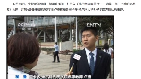 卢捷,2005级对外汉语专业本科生,2014级语言学及应用语言学专业硕士研究生。曾通过孔子学院总部/国家汉办“首批全国汉语教师志愿者”选拔,并在其后的“小语种教师培养计划”中被选派到秘鲁学习西班牙语。因表现优秀,被秘鲁里卡多·帕尔玛大学孔子学院聘为汉语志愿者教师。现为江苏理工学院教师。