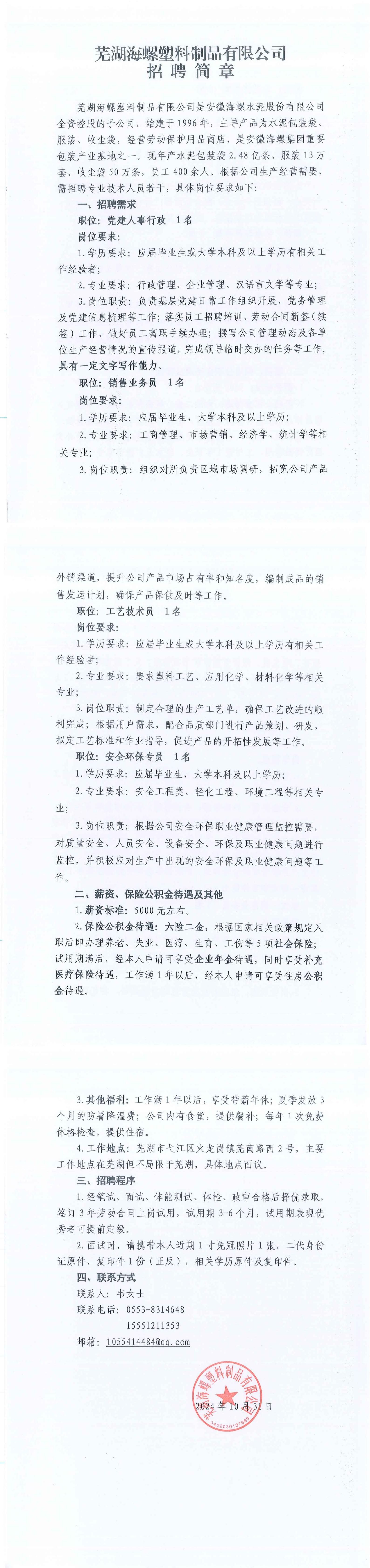 芜湖海螺塑料制品有限公司2024年秋季招聘