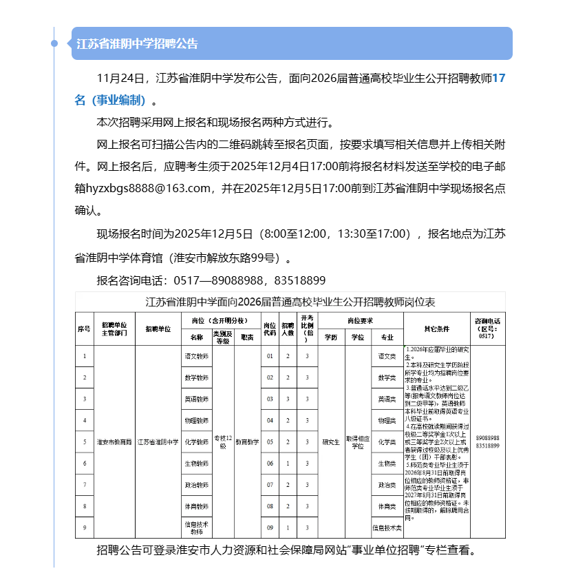 11月24日,江苏省淮阴中学发布公告,面向2026届普通高校毕业生公开招聘教师17名(事业编制)。本次招聘采用网上报名和现场报名两种方式进行。网上报名可扫描公告内的二维码跳转至报名页面,按要求填写相关信息并上传相关附件。网上报名后,应聘考生须于2025年12月4日17:00前将报名材料发送至学校的电子邮箱hyzxbgs8888@163.com,并在2025年12月5日17:00前到江苏省淮阴中学现场报名点确认。现场报名时间为2025年12月5日(8:00至12:00,13:30至17:00),报名地点为江苏省淮阴中学体育馆(淮安市解放东路99号)。