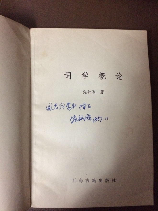 宛先生资历老,住在中文系后面山坡上的小楼里。楼三层,他家住在二楼,位置最好。余老师领我进门后,就看见一位长者,身材高大,脸型也宽大,威严中含着慈祥,有老干部老革命的气派、风度,又多了些学者的内涵和书卷气。看见我们进去,他起身相迎,让座。余老师简单地介绍了我的情况,他说欢迎,简单地寒暄几句,具体说了什么话,已记不得;记得的是,第一次见宛先生,他就把一家出版社约他撰写杨万里一篇诗歌鉴赏文字的任务交给了我,说是我写他修改,我们联合署名。这正是老一辈的做派,算是见面礼吧。后来,我按照约定的时间写出鉴赏稿,单独送给宛先生。他收下稿件,与我谈起别的事情,又问起我写不写旧体诗词,愿意不愿意把写好的给他看。我那时才从小说创作的失败中恢复过来,确实没有兴趣写旧体诗词,但觉得也不妨试试,请先生指导。于是利用几天时间,以中秋节为题,写了一首绝句,找机会送给先生。再次去他家,他把改好的鉴赏稿递给我,只见上面密密麻麻修改了很多,还粘贴几张他补充内容的纸片,让我誊抄好再送过来,然后就谈起诗词鉴赏的问题,并评价前面几届研究生与他、刘老师、余老师写唐诗鉴赏文稿的事。记得他对二位老师和几位研究生所写稿件质量给予充分肯定,特别提到周啸天,说他写得好,手快,撰写了不少条,得到几千元的稿费,对家庭不无小补。我心想:几千元已经很了不起了,因为学校发给我们研究生的生活费,一个月也只有几十元,三年加起来也不到几千元。不由得心生羡慕。对我的那篇习作,宛先生只是轻描淡写地说还要加强训练,我也就知道他不满意,不好意思细问。再一次见面,大约是十一月的一天,记得他把上海古籍出版社新出的他的著作《词学概论》签名赠送给我,上面写着“国忠同学弟指正”,下面署着他的姓名,署时198711月。他说这本书是他根据上课时的讲义修改而成,当年为写讲义,章泰敬给他翻检资料,帮了很大的忙;书出来了,她却在前年底去世,没看到书。说得很轻,甚至还笑了一下。我当时也不知道章泰敬是谁,后来回到宿舍翻看这本书,先生有简短的《后记》,才知道章泰敬是他的夫人,这才隐约感受到他向我说那几句看似轻淡的话时,他内心的真实而深厚的感情,他那一笑的无奈,也才知道痛苦的感情不一定要用痛苦的表情表达。