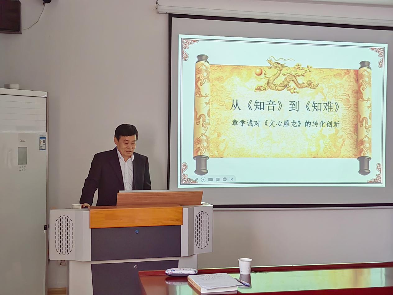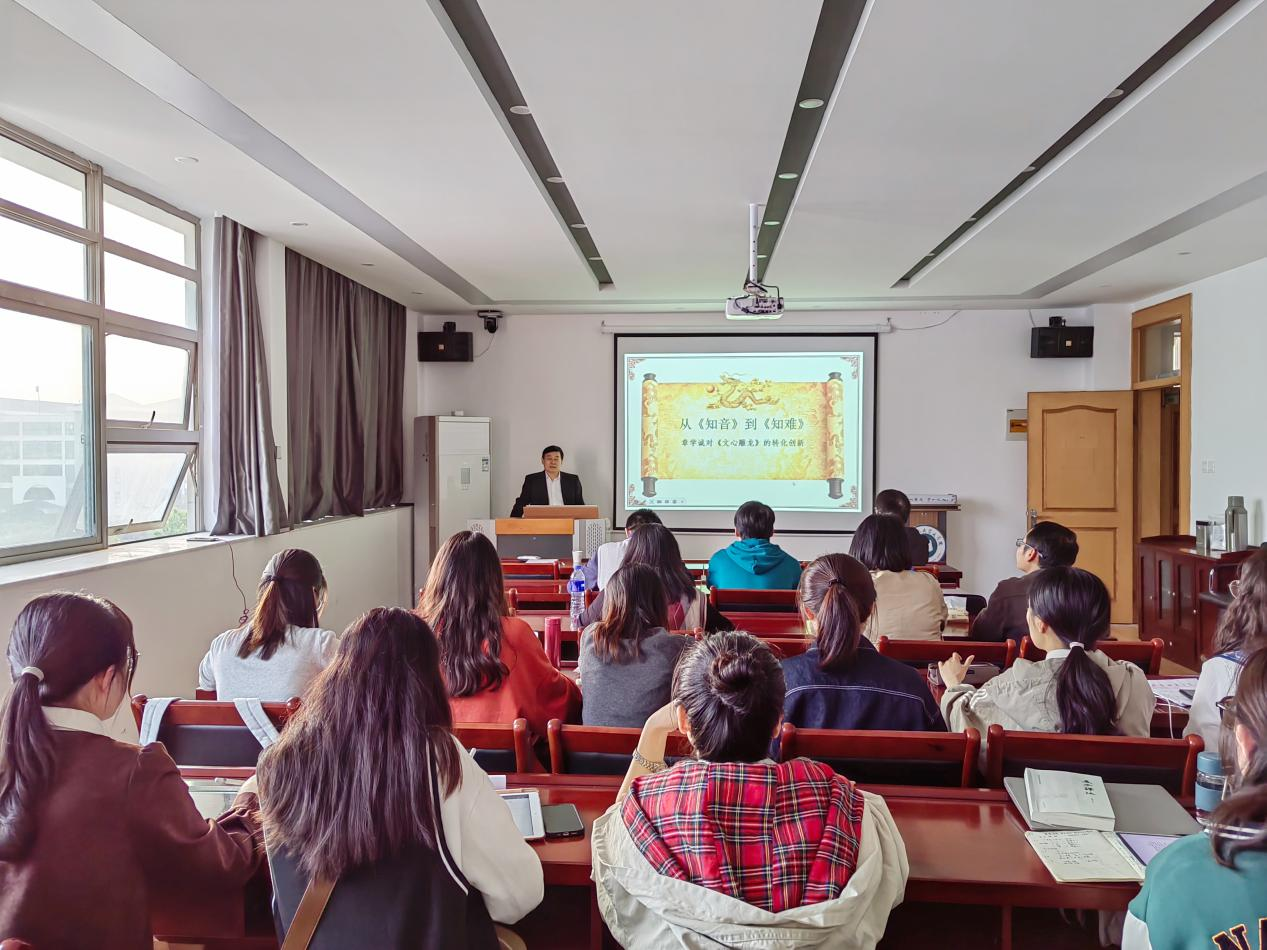 戚良德教授以幽默的开场白进入主题,讲述了开展此次学术交流的缘由,以创新的切入点解读《文心雕龙》,并交代了章学诚先生《知难》创作的学术背景,肯定了章学诚先生对《文心雕龙》研究的贡献。紧接着,戚教授从新视角对刘勰先生《文心雕龙》的《知音》篇以及章学诚先生的《知难》进行阐释,并从章学诚先生的角度反观《知音》,提出“《知难》可以看作是《知音》的延续”这一观点。其后,戚教授带领师生们解读《文心雕龙》之“文”,提出中国文论并不等同于中国古代文学理论,而刘勰提出的文章,即为“四部皆文”。最后评价《文心雕龙》一书是中国文化的教科书,风趣地表示此次交流采用了自己还未公开发表过的文章,表示“知音”难遇,《文心雕龙》也难以被理解透彻。