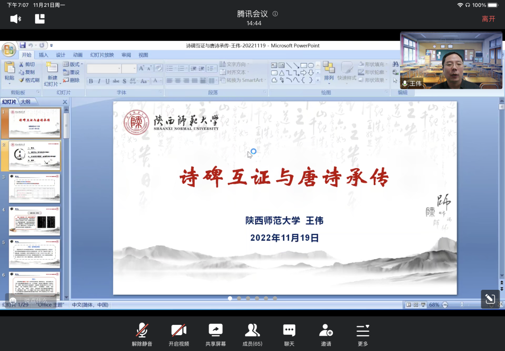 11月21日晚上7:00,“古典文献学学术沙龙”第十六期在腾讯会议线上召开。青年学者、国家社科基金重大招标项目首席专家、美国芝加哥大学访问学者、博士生导师、陕西师范大学必赢线路检测3003no1王伟教授应邀为同学们带来“诗碑互证与唐诗承传”专题讲座。来自省内外多所高校的老师、硕博士研究生70多人齐聚线上,参与活动。本次讲座由韩震军教授主持。