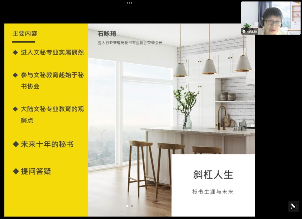 石咏琦教授从自己的校园生活谈起,介绍了自己是如何进入文秘专业、如何走上秘书岗位以及如何开始参与文秘教育。在谈到大陆文秘专业教育存在的问题时,石教授认为,目前文秘专业师资普遍薄弱,教师教学方法落后,教学质量堪忧,秘书学专业的学生对本专业的认可度不高。接着,石咏琦教授进一步指出,秘书学专业的老师要关注时代发展趋势,创新教学方法,改进秘书学教材。秘书学专业的学生要聚焦市场需求,培养操作技能,比如熟练地使用直播软件、会议软件等。