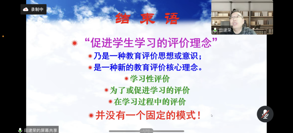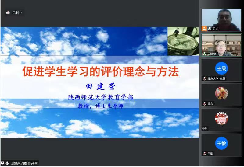 田建荣教授从“从‘以考促学’到‘以评促学’”“‘促进学习的评价理念之内涵”“‘促进学习的评价’之体现:强化过程性评价”“促进学生学习的评价方法举要”“发展(职前)教师促进学生学习的评价素养”五个方面展开分享。