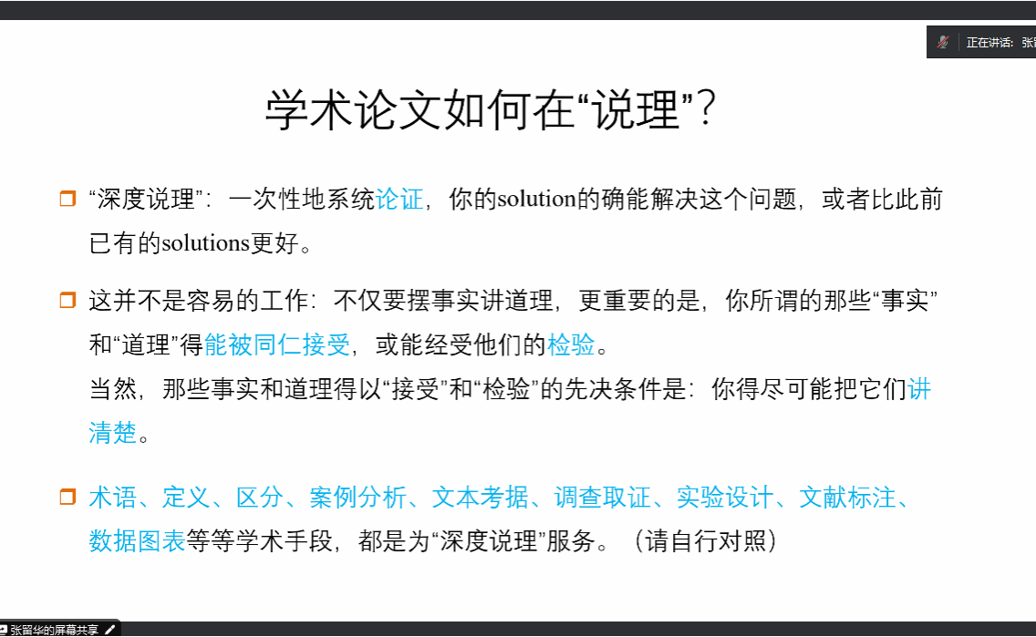接下来,张留华教授从现代网络文化用语和中国古代文化典故出发,重点讲解两小儿辩日的故事,指出我们所追求的重点并非是“说理”,而是“好的说理”。随即,张留华教授全面详细解释了第三个问题,即“说理如何通达‘学术写作’?”他指明“当说理足够深入和精致时,自然就是学术论文的样子了。”即“深度说理”以促成学术写作。通过情景演练对话模式进行观点理由证明和论据的补充与完善,直观向在线参与者展示了将自我观点澄清,进行深度说理的重要性。此外,张教授站在学术论文角度,反过来简述学术论文如何在“说理”的问题。他指明,学术论文的核心在于“深度说理”,清晰准确地向读者系统论证自我观点和理由,且需能经受读者的检验;其次,张留华教授说明,学术论文不是大众科普文章,而是专业的学术研究文献,因此需要严谨的学术态度和多元化学术手段的应用。