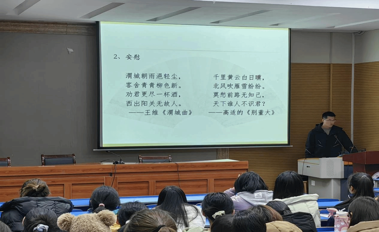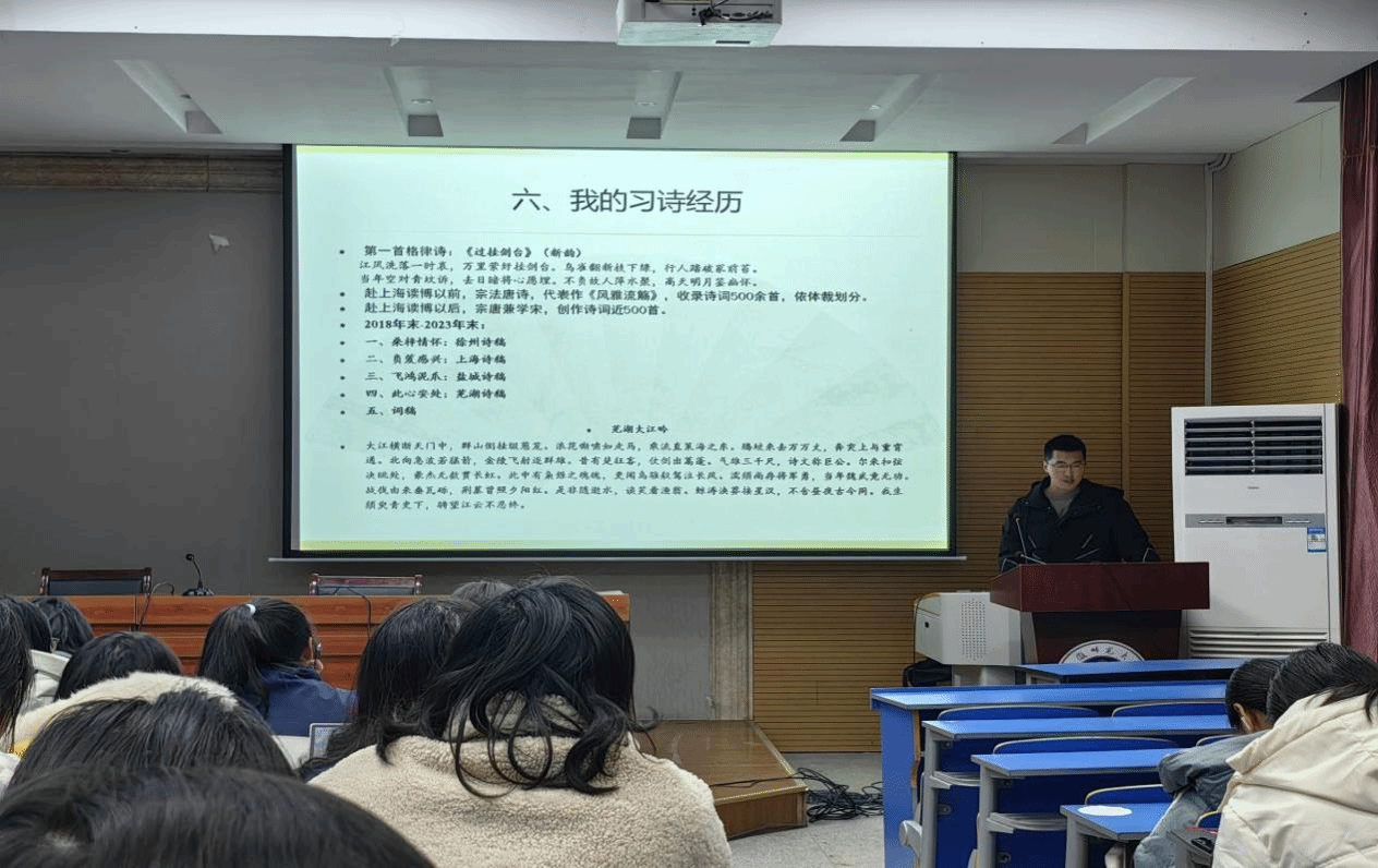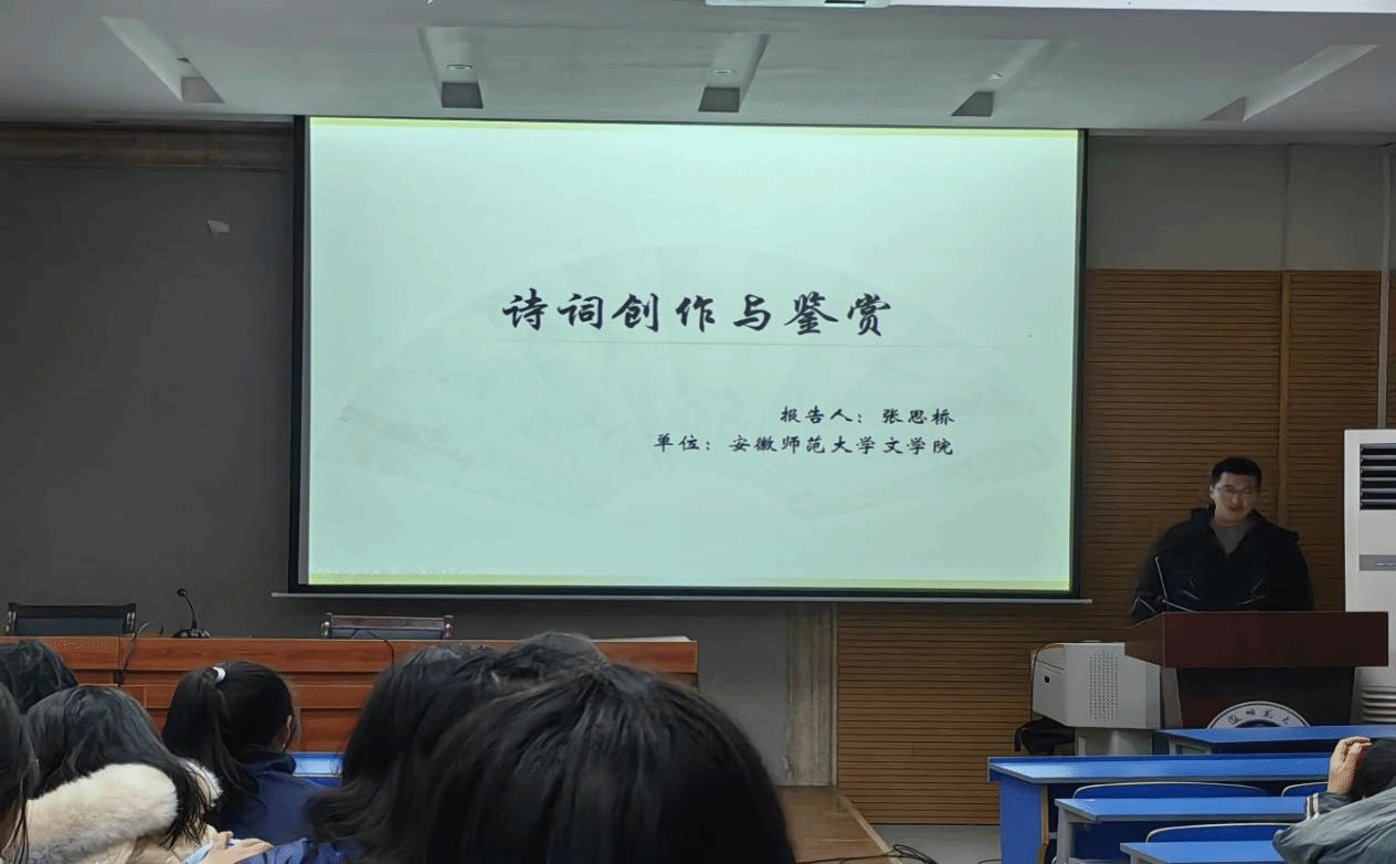 为弘扬中华优秀传统文化、提高同学们的文学素养和其诗词创作与鉴赏能力,12月12日晚,必赢线路检测3003no1“天门山下读书会”于天门山校区图书馆报告厅举行了《诗词创作与鉴赏》专场讲座。本次宣讲会由张思桥老师主讲。