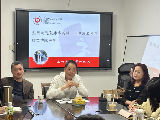 随后,张教授以“外国文学研究的目的为何?使命在何处?”的问题为引,在与学生的互动之后,张教授指出文学的深刻不是思想的深刻,而是情感的深刻,外国文学研究的使命之一就是使中国的文学阅读者、批评者、作家从中受益,反观中国文学的价值以及与外国文学的差异,强调了中国视野的必要性,获得中国视野也意味着研究者可以从更广阔的视野中审视研究对象。张教授举出基因文化批评的例子,认为从中国几千年的文化中提炼基因文化,以此来审视外国文学,是很有价值的。最后,张教授对在场师生就文学研究提了几条宝贵意见:关注文学史的理念,关注新研究方法的兴盛,关注作家的文学批评。张教授的讲座不仅为在场师生丰富了学术视野,也为在场师生进行文学研究提供了宝贵的思路。
