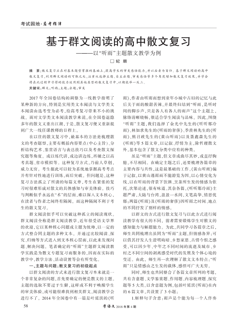 基于群文阅读的高中散文复习--以“听雨”主题散文教学为例