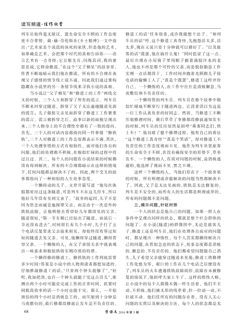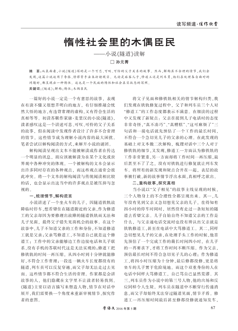 惰性社会里的木偶臣民--小说《隧道》解读